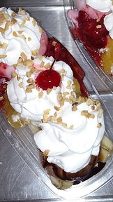 Your favorite 3 scoops of Premium hand dipped Ice Cream on top of a layer of homemade waffle chips and topped with your favorite 3 toppings, whip cream, peanuts, and cherries.